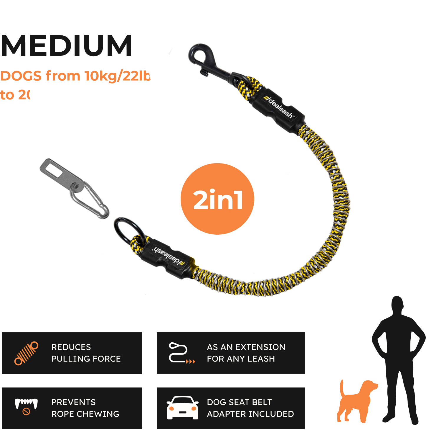 Idealeash Flextender adapter za povodec je edini pripomoček, ki ga potrebujete 2-v-1: neverjeten podaljšek za povodec, ki reši težavo, ko pes vleče in žveči povodec, in univerzalni adapter za varnostni pas za varen prevoz vašega psa.