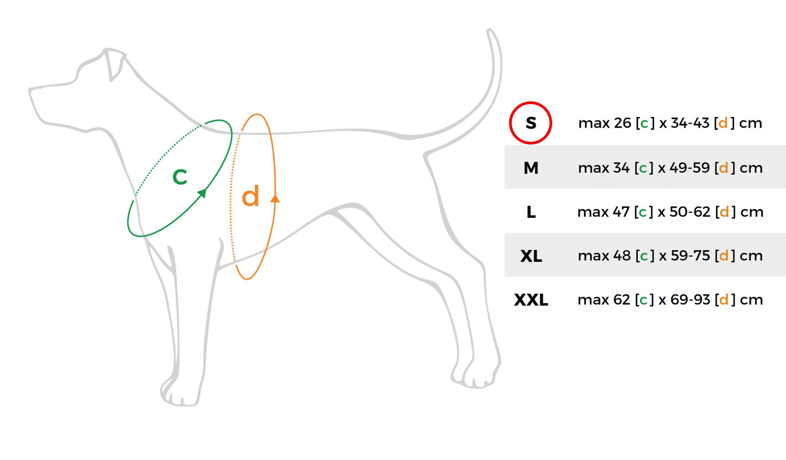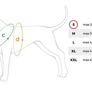 Oprsnico lahko preprosto namestite z dvema zaponkama na hrbtnih trakovih, tako da ju napnete le čez glavo psa. Velik razpon prilagajanja prsnega traku vam omogoča, da se zelo dobro prilega večini psov.
