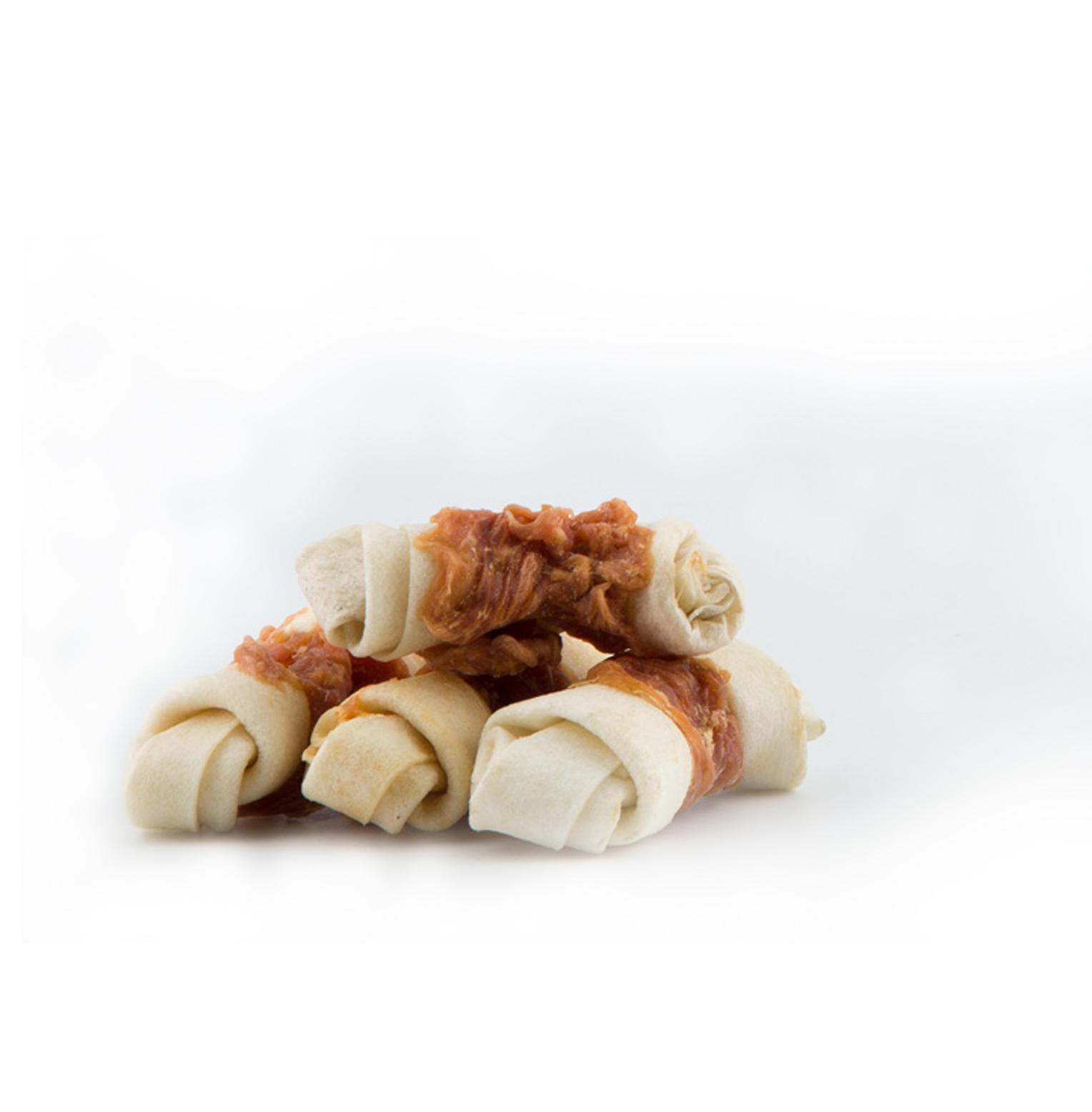 Surova goveja koža ovita v piščančje fileje. Primerno za pse lažje od 6 kg. To je najboljši način za nagrado, pomiritev ali sprostitev ob žvečenju, predvsem za mladičke.