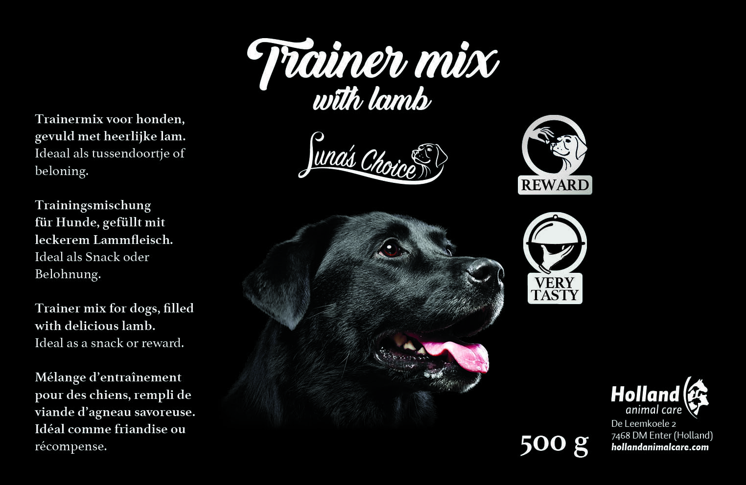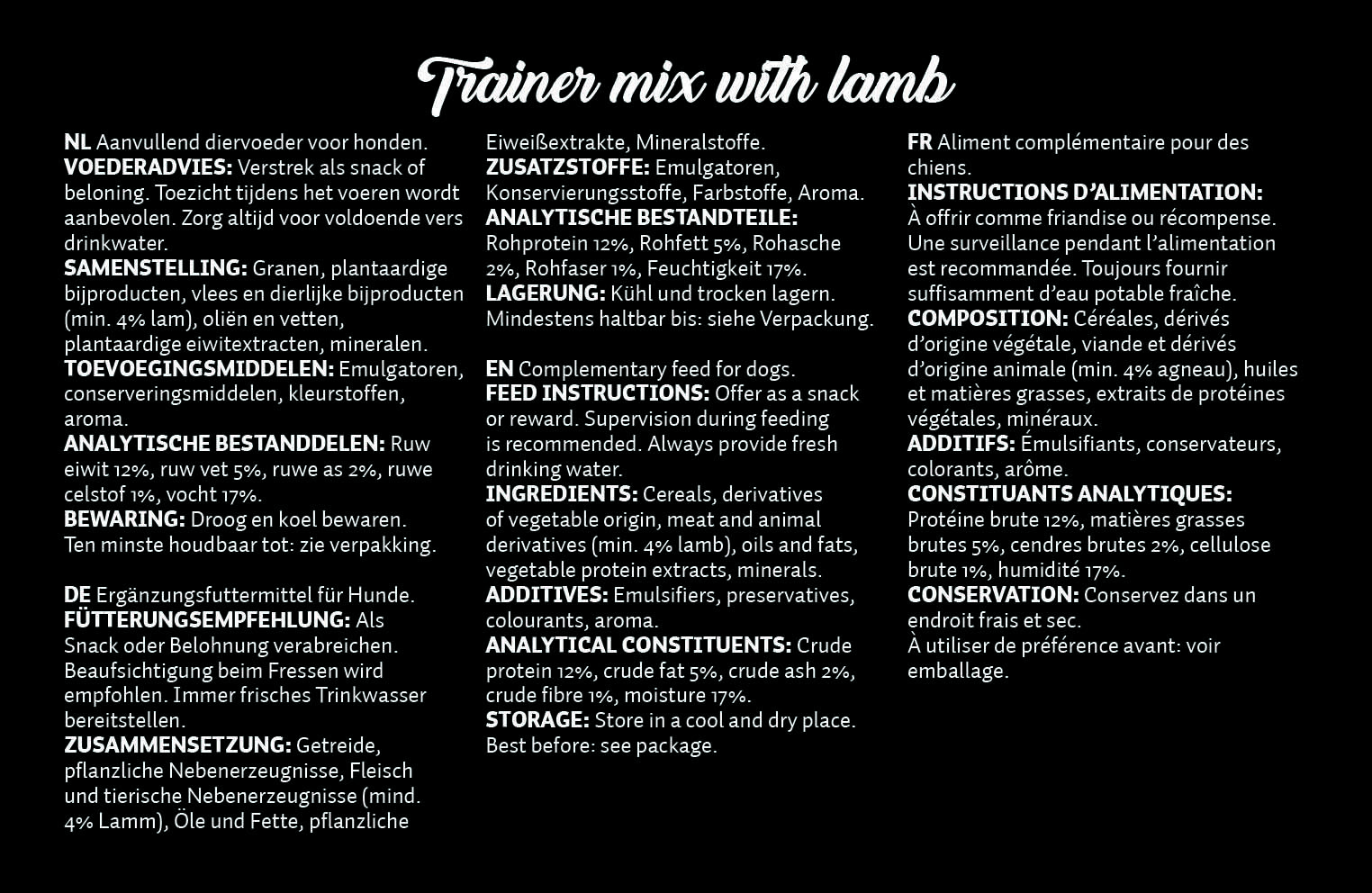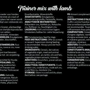 Ta prigrizek je napolnjen z okusnim mesom jagnjetine in je napol vlažna mehka nagrada. To pomeni, da so ti prigrizki še rahlo vlažni in zato izjemno močnega okusa in vonja. Zato je to idealen prigrizek za vodnike psov, da svojega psa nagradijo za odličen trening. Ti prigrizki ne vsebujejo dodanih sladkorjev in barvil in so izdelani na Nizozemskem.